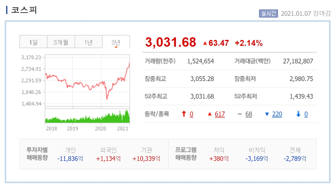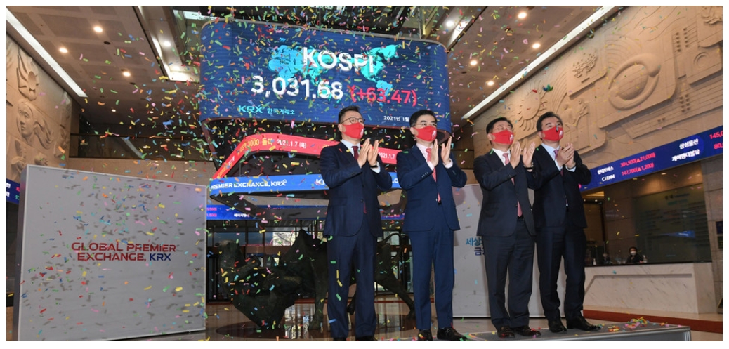 2021년 1월 7일 코스피 종가 기준 사상 첫 3,000을 돌파한 3,031 기록