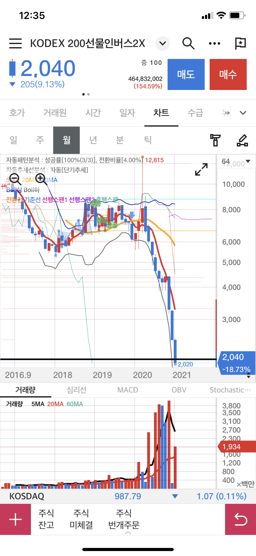 코스피가 가장 많이 빠질때 곱버스는 12,815원을 기록했으나, 1월 8일 현재 2,040원이다.