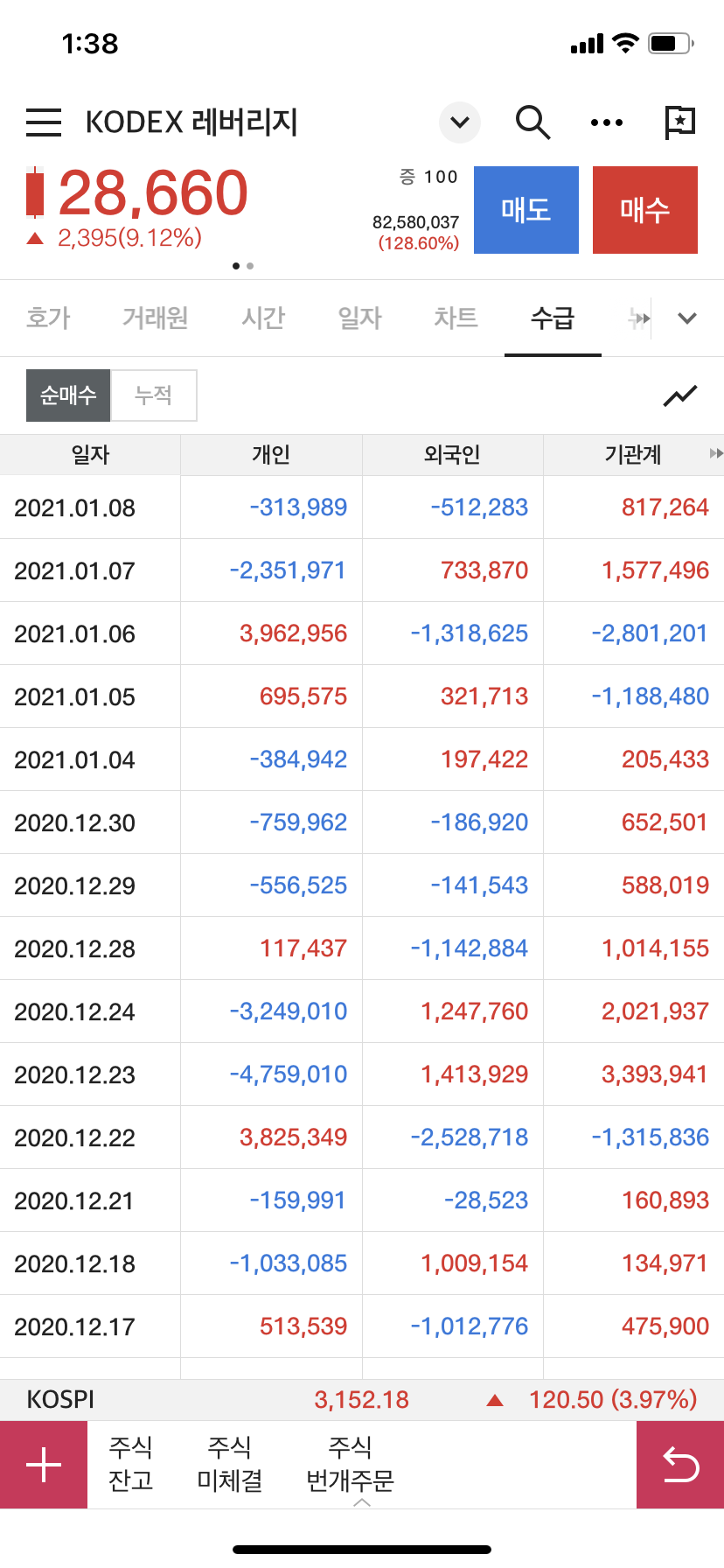KODEX 레버리지 수급을 보면 개미들은 코스피가 장중 3,000포인트를 터치하고 밀릴 때 매수하고 이후, 7일부터는 매도중인 모습이 나타났다.