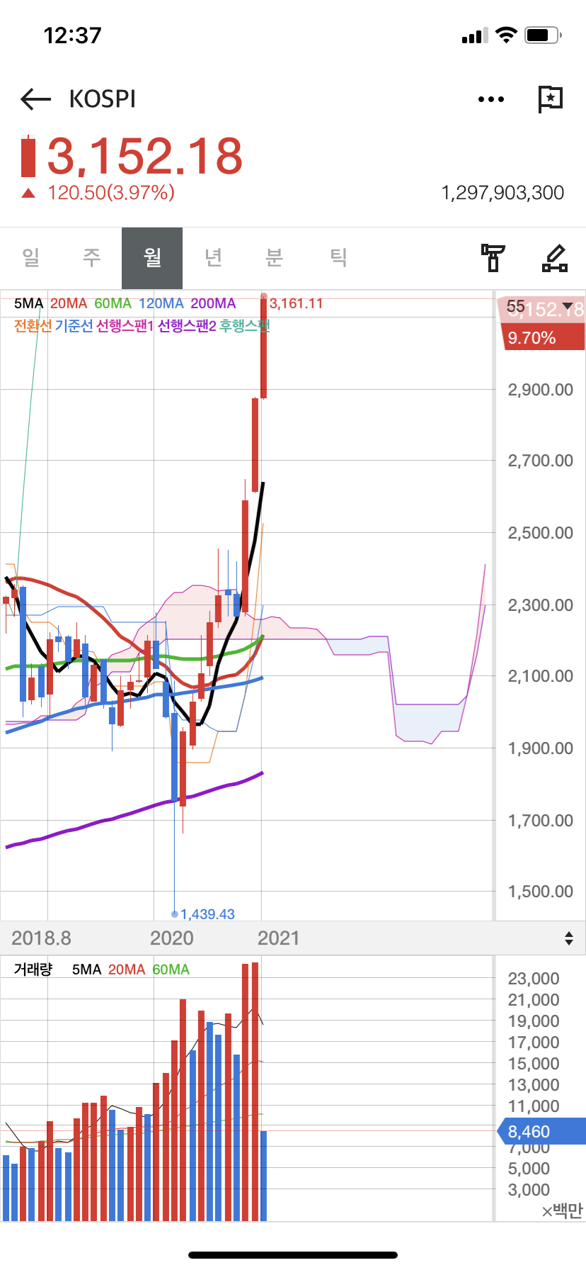 2020년 1,439포인트를 찍었는데, 2021년 1월 8일 종가 기준 코스피는 3,152포인트이다.