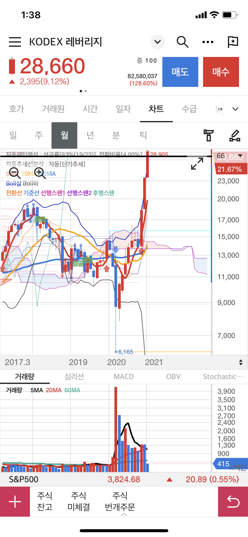 KODEX 레버리지는 위에 설명했듯이 코스피 상승을 추종하며, 코스피 상승하면 같이 오른다.