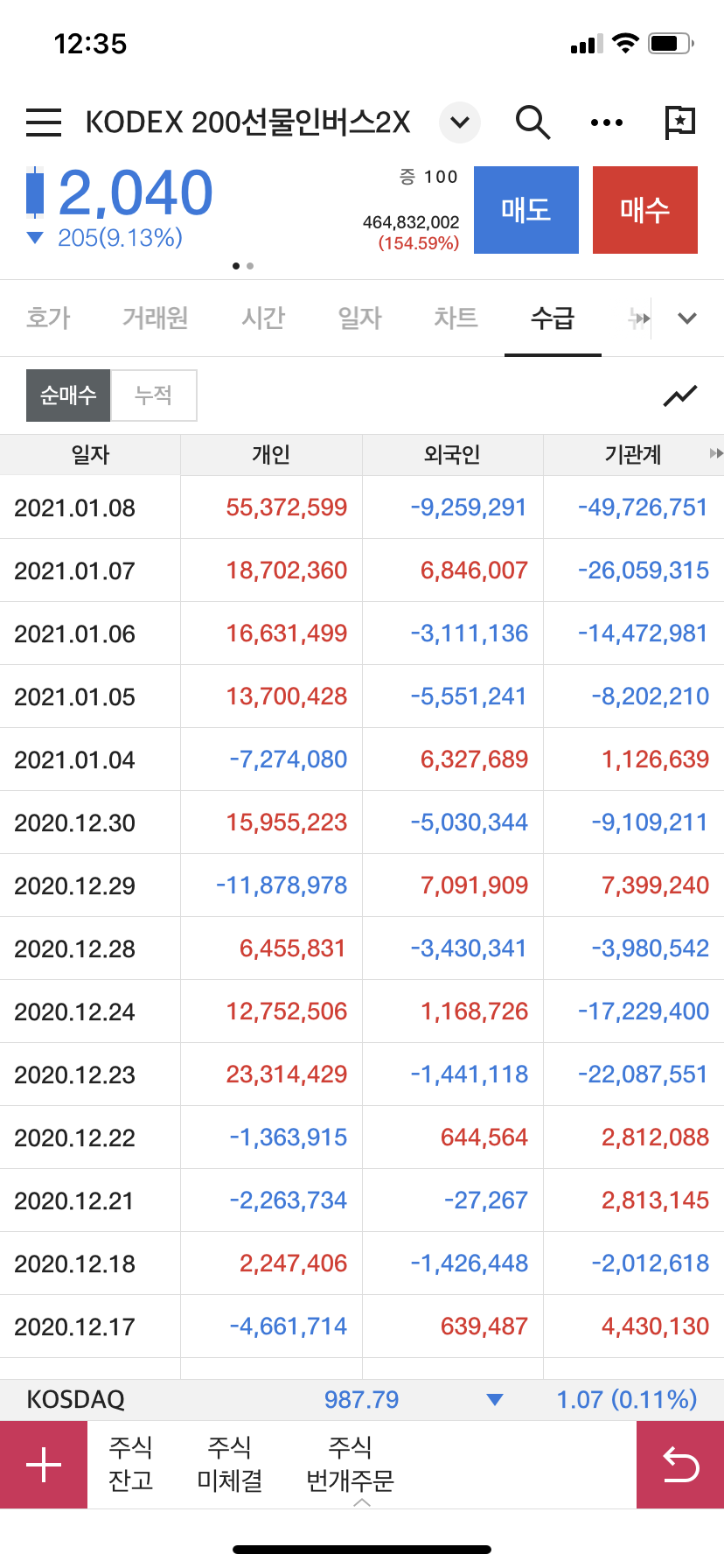 곱버스 수급을 보면, 저번달 말부터 개인들의 순매수가 엄청나다. 특히 1월 8일에는 5,500만주의 곱버스를 쓸어갔다.