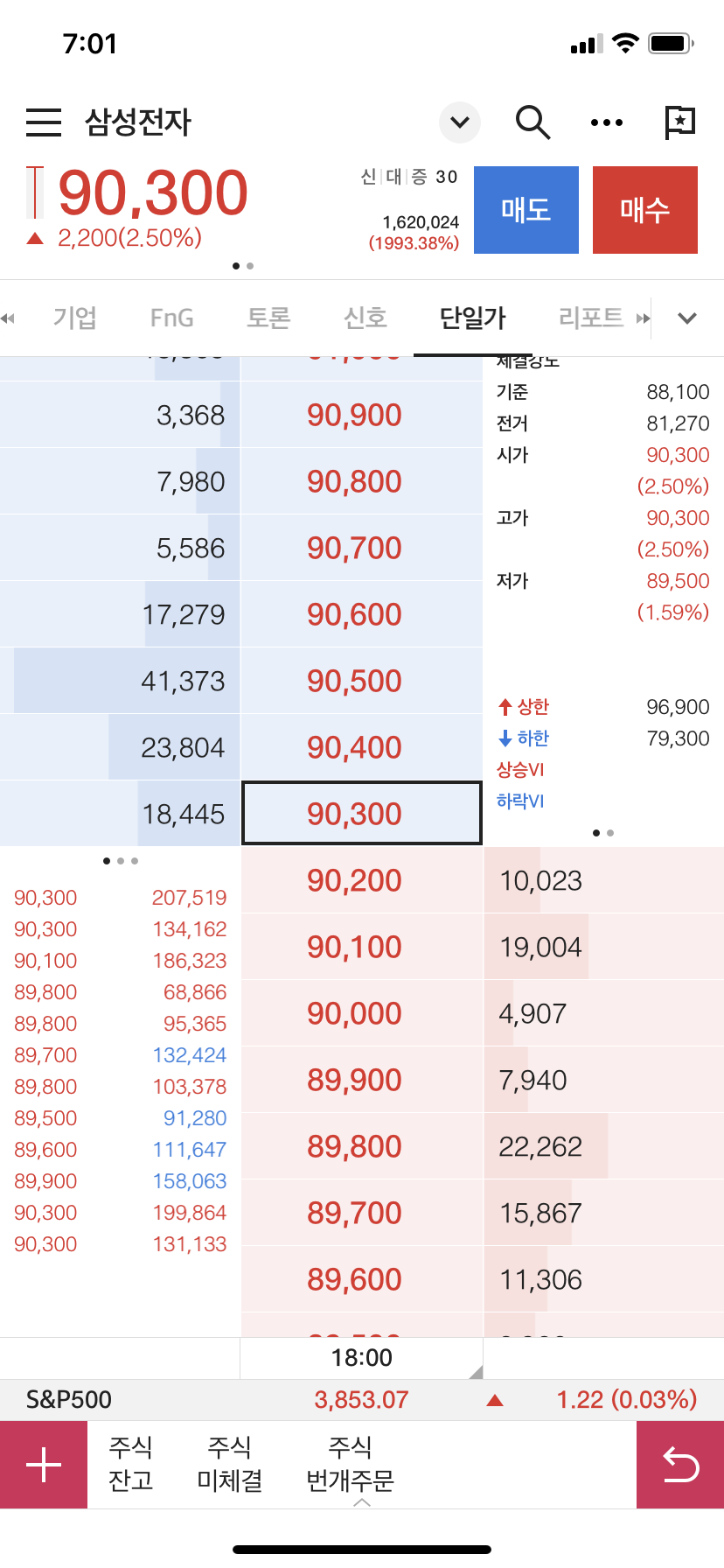 1월 21일 삼성전자 시외마감 2.5% 상승한 90,300원