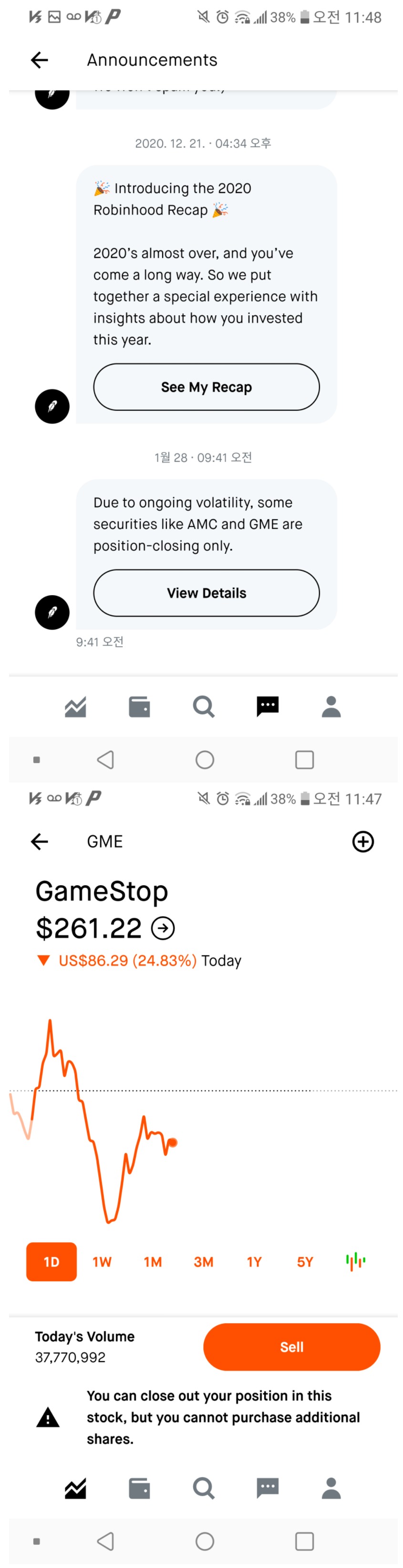 로빈후드가 2021년 1월 28일 amc, gme 등 일부 종목의 매수 버튼을 막아버렸다.