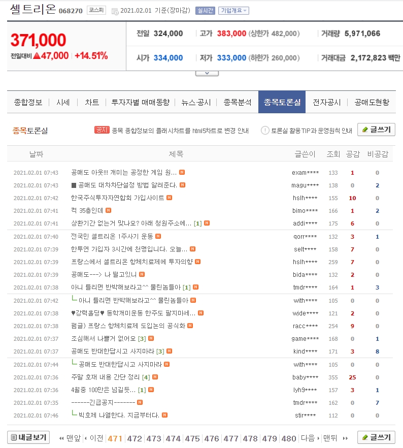 네이버 종목토론방(종토방) 캡처인데 하루만 지났는데, 2월 1일 개장 전 게시판을 찾으려고 470번이나 뒤로 갔네..