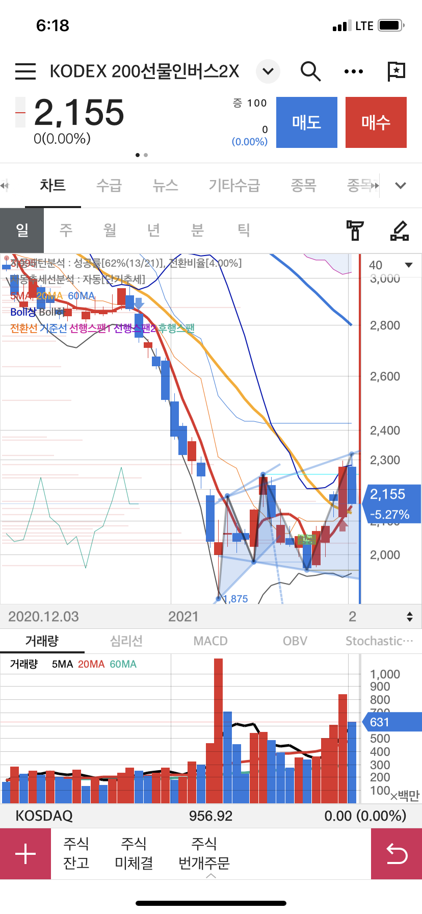 하지만 개인의 순매도가 이어지고 외국인과 기관이 쓸어 담으며 곱버스는 -5.27% 2,155원에 마감했다.