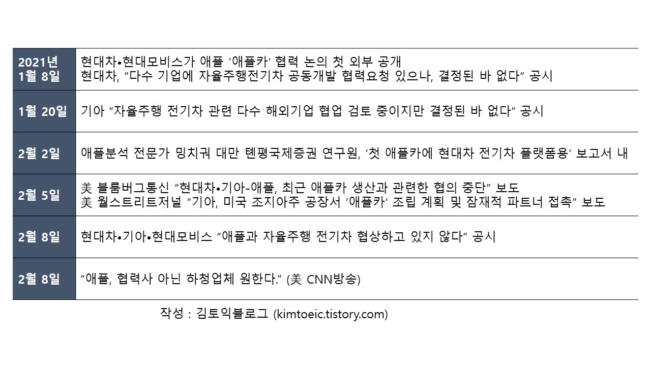 본 글에 앞서 현대차와 애플의 협상과정의 정확한 사실을 알 수는 없다.