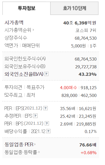 2021년 고가 828,000원 (2017년 저가 대비 8.11배 상승)