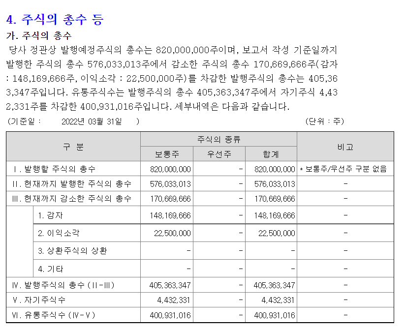 2021년 3월 31일 기준 기아 주식의 총수를 보시면,